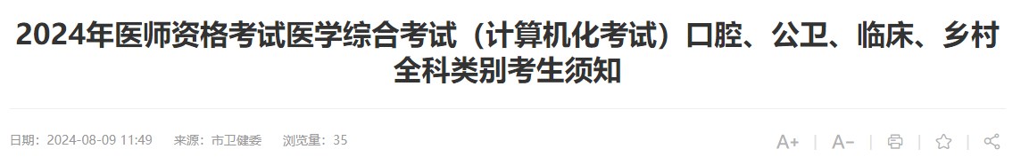 2024年醫(yī)師資格考試醫(yī)學(xué)綜合考試(計(jì)算機(jī)化考試)口腔、公衛(wèi)、臨床、鄉(xiāng)村全科類別考試時(shí)間為8月16日—18日。為做好考試期間有關(guān)工作,現(xiàn)將有關(guān)要求告知如下,請(qǐng)全體考生遵守執(zhí)行。