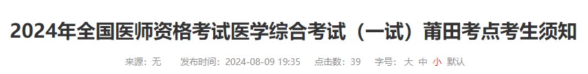 2024年全國(guó)醫(yī)師資格考試醫(yī)學(xué)綜合考試將于8月16日-18日舉行。為做好莆田考點(diǎn)考試工作,現(xiàn)將有關(guān)事項(xiàng)公告如下,請(qǐng)各位考生知悉。