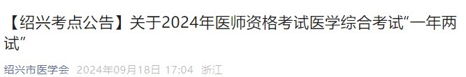 根據(jù)國(guó)家衛(wèi)生健康委醫(yī)師資格考試委員會(huì)辦公室《關(guān)于2024年醫(yī)師資格考試醫(yī)學(xué)綜合考試“一年兩試”工作的通知》(國(guó)衛(wèi)醫(yī)考委辦發(fā)〔2024〕5號(hào))和浙江省醫(yī)師資格考試領(lǐng)導(dǎo)小組辦公室《關(guān)于開展2024年醫(yī)師資格考試醫(yī)學(xué)綜合考試“一年兩試”工作的通知》精神。現(xiàn)就紹興考點(diǎn)有關(guān)事項(xiàng)通知如下: