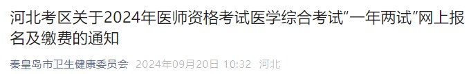 逾期不能補(bǔ)報(bào)!河北秦皇島2024醫(yī)師資格“一年兩試”報(bào)名繳費(fèi)24日結(jié)束!請相關(guān)考生及時(shí)查看通知內(nèi)容,按時(shí)完成報(bào)名繳費(fèi)工作!