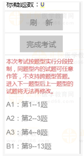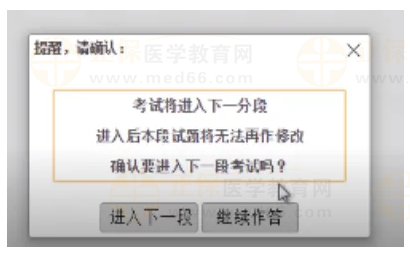 醫(yī)師資格考試計(jì)算機(jī)化考試系統(tǒng)對(duì)“分段控制”功能進(jìn)行了優(yōu)化升級(jí)。以題型進(jìn)行分段(如:A1、A2、A3/A4、B1),考生必須完成同一題型內(nèi)全部試題作答后,方可進(jìn)入下一題型。
