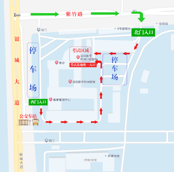 一、口腔實(shí)踐技能考試基地設(shè)在益陽(yáng)醫(yī)學(xué)高等專科學(xué)校附屬口腔醫(yī)院(銀城大道與紫竹路交匯處),考生可坐3、28、108路公交車、益寧城際98路、309魚形山、307龍嶺專線到達(dá)益陽(yáng)醫(yī)專(西門)??忌胶笳?qǐng)按指引的路線從醫(yī)院西門或北門進(jìn)入基地,考生考試的工作服由基地統(tǒng)一提供,在一樓完成存包、換領(lǐng)工作服、安檢后,按指引路線到五樓總候考室候考,再按規(guī)定流程完成考試。