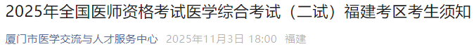 2025年全國(guó)醫(yī)師資格考試醫(yī)學(xué)綜合考試(二試)將于11月8-9日舉行。為做好福建考區(qū)考試工作,現(xiàn)將有關(guān)事項(xiàng)公告如下,請(qǐng)各位考生知悉。
