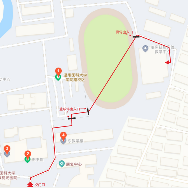 注:由于學(xué)校當(dāng)前尚處于疫情防控期間,要求所有考生一律綠色出行,不得開車進(jìn)校??忌ê?nèi)考生)一律從溫州醫(yī)科大學(xué)學(xué)院路校區(qū)南大門進(jìn)入,“亮健康碼+測體溫+戴口罩”并核驗(yàn)準(zhǔn)考證后沿校內(nèi)指示路標(biāo)到達(dá)考場,考完的考生在引導(dǎo)員的引導(dǎo)下經(jīng)考試專用通道立即離開考場,并從校區(qū)東大門離開學(xué)校。