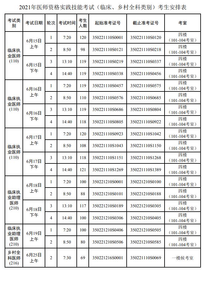 福州考點2021年醫(yī)師資格實踐技能考試(臨床、鄉(xiāng)村全科類別)考試安排表