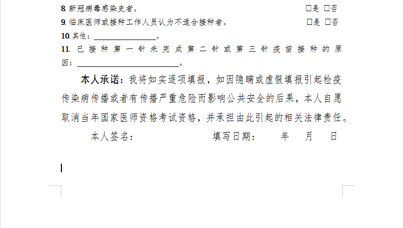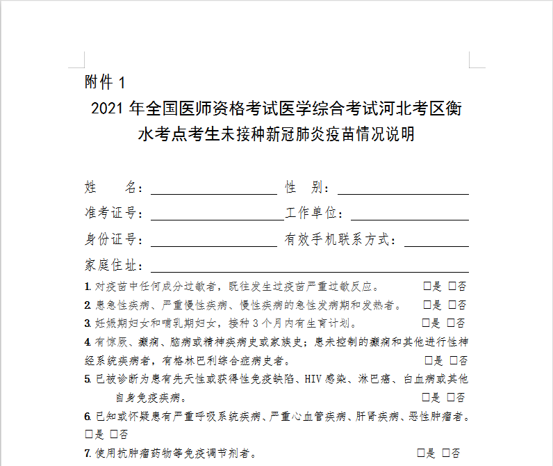 附件: 2021年全國(guó)醫(yī)師資格考試醫(yī)學(xué)綜合考試河北考區(qū)衡水考點(diǎn)考生未接種新冠肺炎疫苗情況說明