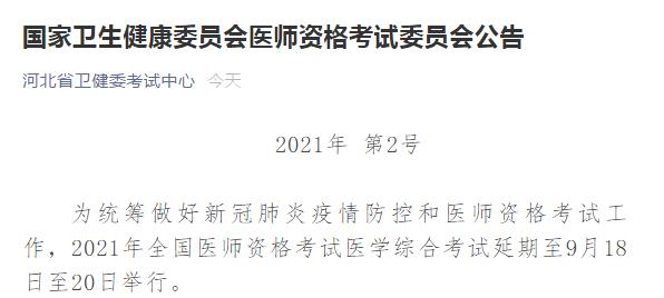 為統(tǒng)籌做好新冠肺炎疫情防控和醫(yī)師資格考試工作,2021年全國醫(yī)師資格考試醫(yī)學(xué)綜合考試延期至9月18日至20日舉行。