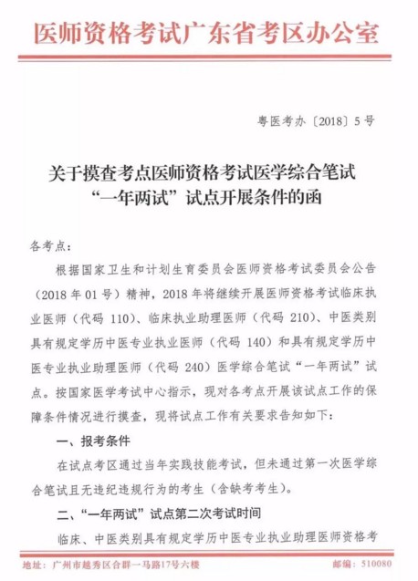 最近有消息稱廣東省列為2018年醫(yī)師資格考試“一年兩試”的試點(diǎn)地區(qū),目前廣東省各地區(qū)的官方網(wǎng)站上暫時還沒有公布通知,不過小編已經(jīng)電話咨詢過廣東省醫(yī)師協(xié)會,確認(rèn)2018年廣東省還未列為醫(yī)師資格考試“一年兩試”的試點(diǎn)地區(qū),只是有摸查考點(diǎn)的函。不過小編建議大家還是以官方文件通知為準(zhǔn)。