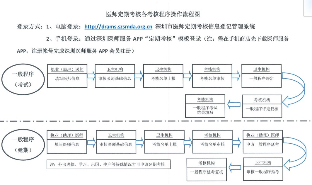 醫(yī)師定期考核各考核程序操作流程圖(包含考試/延期/免考)分享給大家,深圳市醫(yī)師定期考核各考核程序操作流程圖如下,醫(yī)學教育網(wǎng)編輯整理。