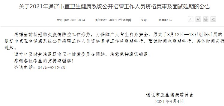 根據(jù)當前新冠肺炎疫情防控工作形勢,為保障廣大考生自身安全,原定于8月12日—13日組織開展的通遼市直衛(wèi)生健康系統(tǒng)公開招聘工作人員資格復(fù)審工作將延期舉行,面試時間也延期舉行,具體時間另行通知。