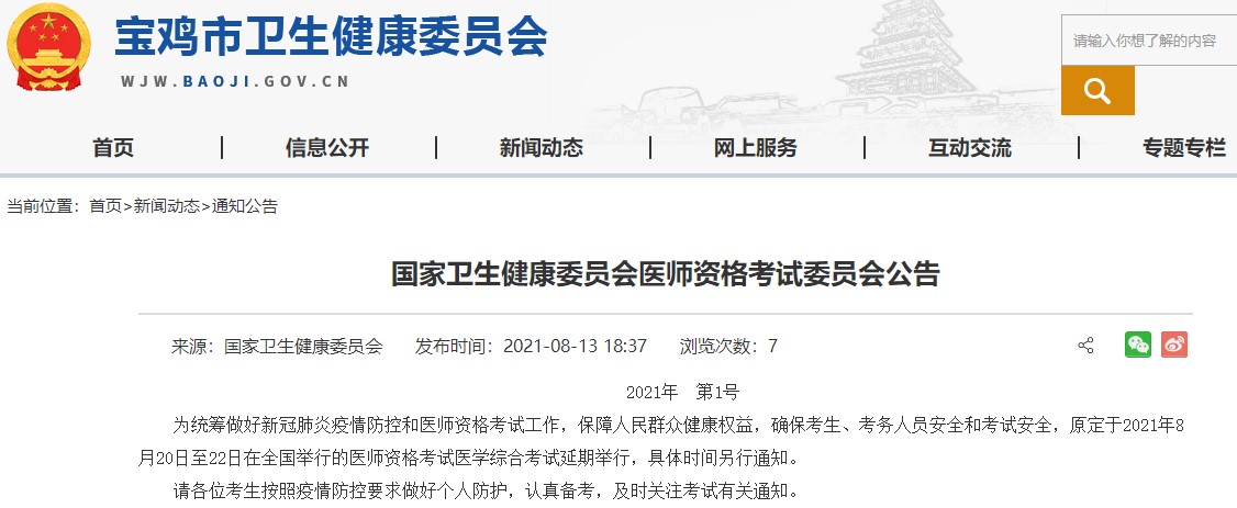 為統(tǒng)籌做好新冠肺炎疫情防控和醫(yī)師資格考試工作,保障人民群眾健康權(quán)益,確??忌⒖紕?wù)人員安全和考試安全,原定于2021年8月20日至22日在全國舉行的醫(yī)師資格考試醫(yī)學(xué)綜合考試延期舉行,具體時(shí)間另行通知。