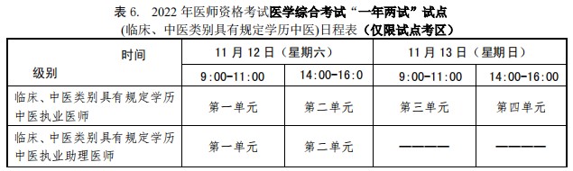 2022年醫(yī)師資格考試醫(yī)學(xué)綜合考試“一年兩試”試點考試(計算機(jī)化考試)時間為 11 月 12日至 13 日,每單元時長 2 小時。(各類別考試時間時間詳見表 6)。