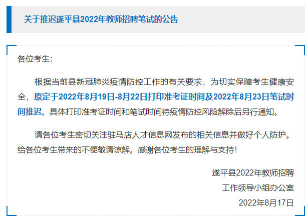 目前遂平縣確實因為疫情延期舉行部分考試,比如關于推遲遂平縣2022年教師招聘筆試。考生可以主動聯(lián)系當?shù)兀?/span>駐馬店考點醫(yī)師資格考試辦公室聯(lián)系電話:0396-2915545。