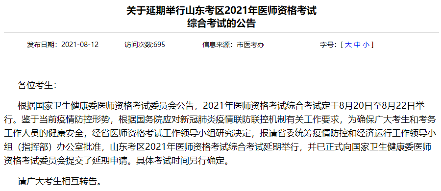 根據(jù)國家衛(wèi)生健康委醫(yī)師資格考試委員會公告,2021年醫(yī)師資格考試綜合考試定于8月20日至8月22日舉行。鑒于當前疫情防控形勢,根據(jù)國務(wù)院應(yīng)對新冠肺炎疫情聯(lián)防聯(lián)控機制有關(guān)工作要求,為確保廣大考生和考務(wù)工作人員的健康安全,經(jīng)省醫(yī)師資格考試工作領(lǐng)導小組研究決定,報請省委統(tǒng)籌疫情防控和經(jīng)濟運行工作領(lǐng)導小組(指揮部)辦公室批準,山東考區(qū)2021年醫(yī)師資格考試綜合考試延期舉行,并已正式向國家衛(wèi)生健康委醫(yī)師資格考試委員會提交了延期申請。具體考試時間另行確定。