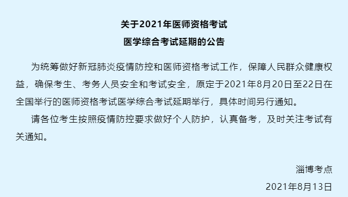 山東淄博2021年醫(yī)師資格考試醫(yī)學綜合筆試確定延期,具體考試時間另行通知。醫(yī)學教育網(wǎng)小編搜集整理如下: