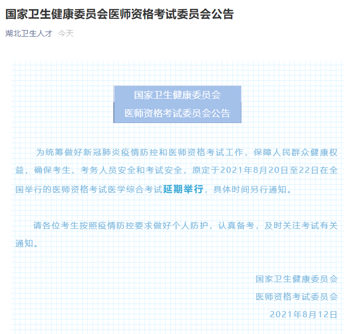 為統(tǒng)籌做好新冠肺炎疫情防控和醫(yī)師資格考試工作,保障人民群眾健康權(quán)益,確??忌?、考務(wù)人員安全和考試安全,原定于2021年8月20日至22日在全國舉行的醫(yī)師資格考試醫(yī)學(xué)綜合考試延期舉行,具體時(shí)間另行通知。