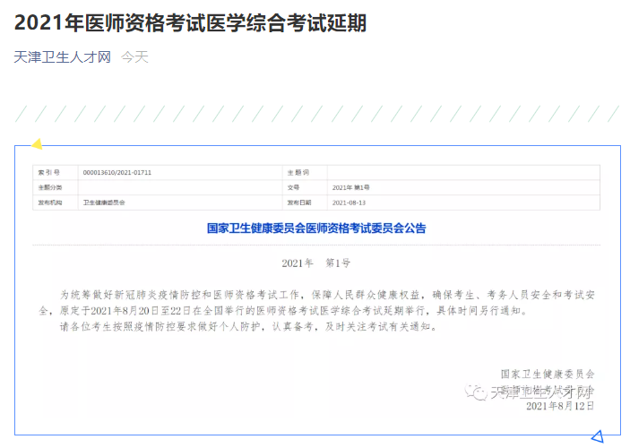 2021年天津考區(qū)醫(yī)師資格考試醫(yī)學(xué)綜合考試延期