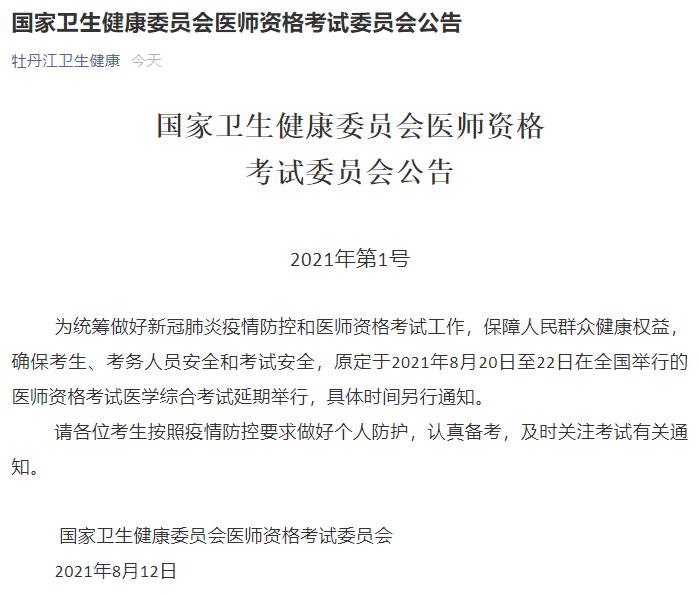 全國延期官宣!國家衛(wèi)生健康委員會醫(yī)師資格考試委員會公告(2021年第1號)