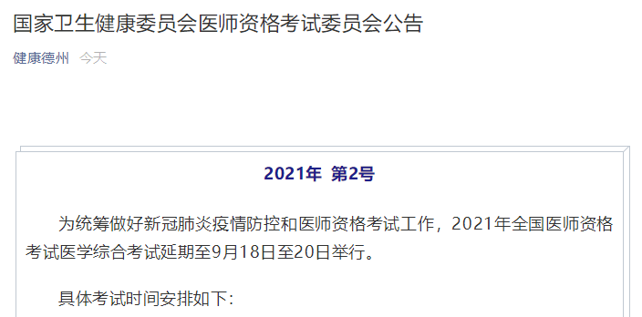 醫(yī)政醫(yī)管局:全國2021年醫(yī)師資格考試時間確定:9月18日至20日!