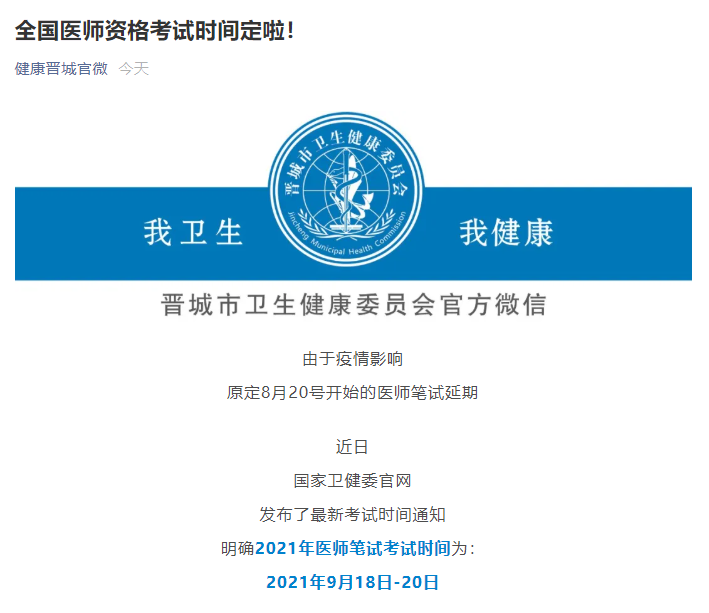 2021年全國醫(yī)師資格考試晉城考點綜合筆試時間定了!國家衛(wèi)健委官網(wǎng)發(fā)布了最新考試時間通知,明確2021年醫(yī)師筆試考試時間為:2021年9月18日-20日,具體通知內(nèi)容醫(yī)學(xué)教育網(wǎng)小編整理如下: