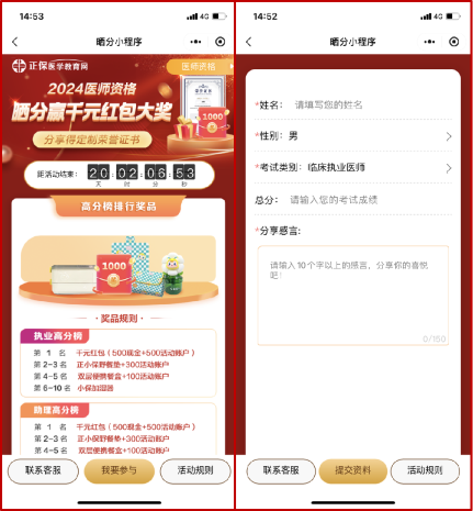 從備考到取證,你所有的努力都值得被記錄下來!快快參與【正保醫(yī)學(xué)教育網(wǎng)】2024年醫(yī)師資格考試曬分有禮活動,豐厚獎品等你拿!