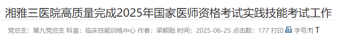 2025年6月14日至22日,湘雅三醫(yī)院作為湖南省七家國(guó)家醫(yī)師資格實(shí)踐技能考試(臨床類別)國(guó)家級(jí)基地之一中南大學(xué)湘雅醫(yī)學(xué)院基地掛靠單位,以高標(biāo)準(zhǔn)、高質(zhì)量的考務(wù)組織工作圓滿完成2025年國(guó)家醫(yī)師資格考試實(shí)踐技能考試(臨床類別)任務(wù)。此次共承接考生3199名。全省14家醫(yī)院、131名考官,中南大學(xué)3家附屬醫(yī)院共96名考務(wù)人員、77名志愿者參與了相關(guān)工作。
