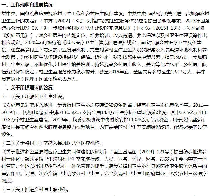 國(guó)家關(guān)于落實(shí)鄉(xiāng)村醫(yī)生待遇健全農(nóng)村衛(wèi)生健康體系助力脫貧攻堅(jiān)健康村鎮(zhèn)建設(shè)的建議答復(fù)!