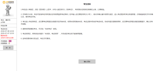 考生成功登錄考試系統(tǒng)后,右側(cè)主頁(yè)面顯示考生的基本信息,左側(cè)主要顯示考生信息、試卷名稱、考試時(shí)間、考試時(shí)間倒計(jì)時(shí)提醒、考生未答題和標(biāo)疑題數(shù)量提醒??忌紫韧ㄟ^(guò)右側(cè)考生信息區(qū)域核對(duì)信息,核對(duì)完成后,點(diǎn)擊“確認(rèn)”按鈕進(jìn)入下一頁(yè)面。