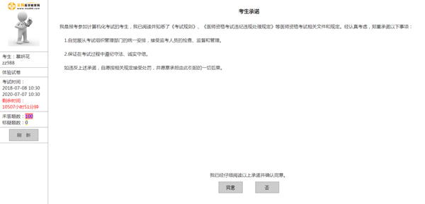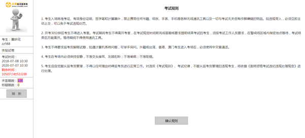 在考生基本信息頁(yè)面,點(diǎn)擊“確認(rèn)”按鈕進(jìn)入考試規(guī)則及考生承諾頁(yè)面。在認(rèn)真閱讀此頁(yè)面信息后依次點(diǎn)擊下方的按鈕進(jìn)入下一頁(yè)面。 點(diǎn)擊“進(jìn)入考試”后,如全國(guó)統(tǒng)一考試時(shí)間已到,則進(jìn)入試題頁(yè)面。如統(tǒng)一考試時(shí)間未到,則顯示“還有**分鐘開(kāi)始考試”的提示。