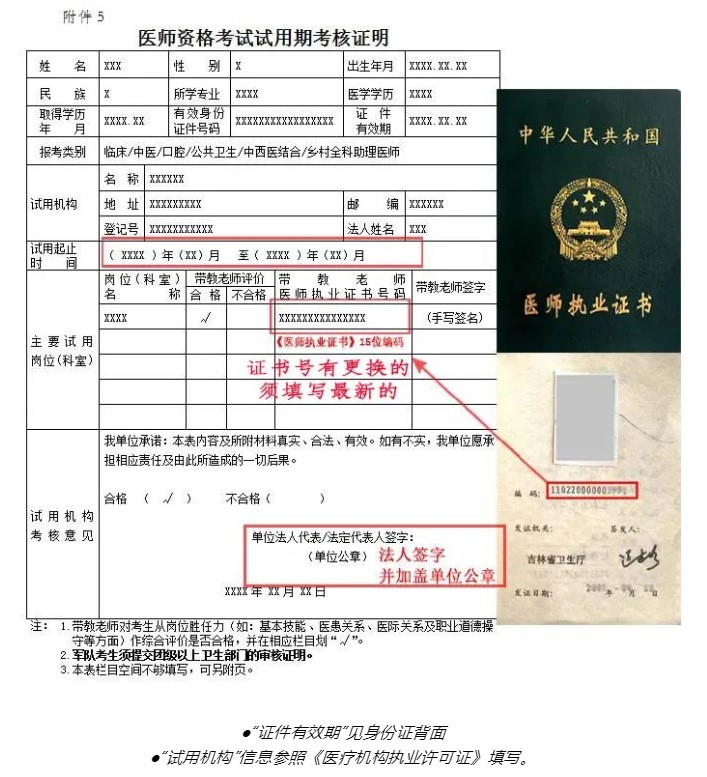 5、試用期合格證明:打印《醫(yī)師資格考試試用期考核證明》附件5(請登錄國家醫(yī)學(xué)考試網(wǎng)考生服務(wù)系統(tǒng)下載),須由試用單位法定代表人簽字并加蓋單位公章;