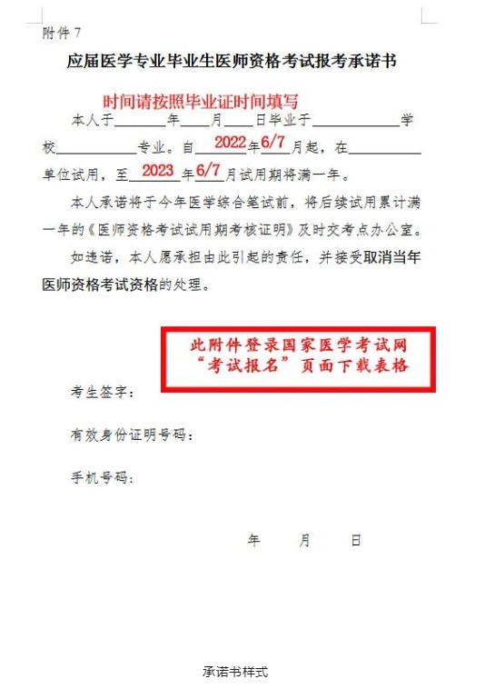9、應(yīng)屆畢業(yè)生還需提供《應(yīng)屆醫(yī)學(xué)專業(yè)畢業(yè)生醫(yī)師資格考試報(bào)考承諾書》,請登錄國家醫(yī)學(xué)考試網(wǎng)考生服務(wù)系統(tǒng)下載;