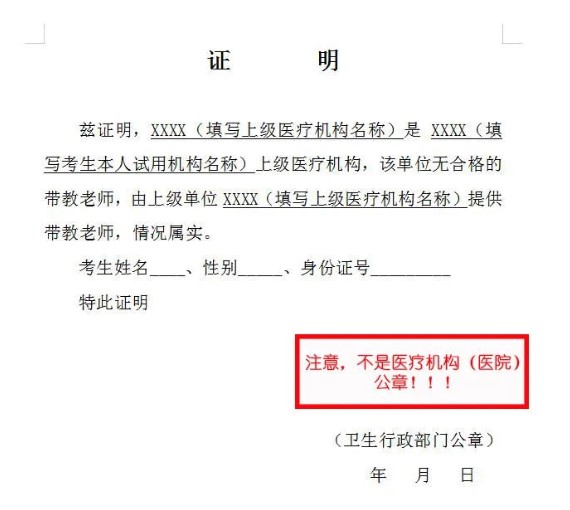 須用上級醫(yī)療機(jī)構(gòu)的帶教老師資格證與執(zhí)業(yè)證復(fù)印件并加蓋公章,考核證明需加蓋上級機(jī)構(gòu)和本人所在單位公章各一個(兩個章),并出具醫(yī)聯(lián)體證明,并加蓋衛(wèi)生行政部門公章,無證明的需填寫附件《上級醫(yī)療機(jī)構(gòu)出具帶教老師的證明》加蓋衛(wèi)生行政部門公章,附件下載方式見文末)