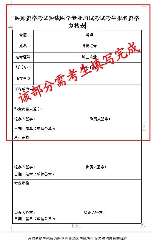 11、報考執(zhí)業(yè)醫(yī)師短線加試的考生還需提交2份《醫(yī)師資格考試短線醫(yī)學專業(yè)加試考試考生報名資格復核表》,樣式如下: