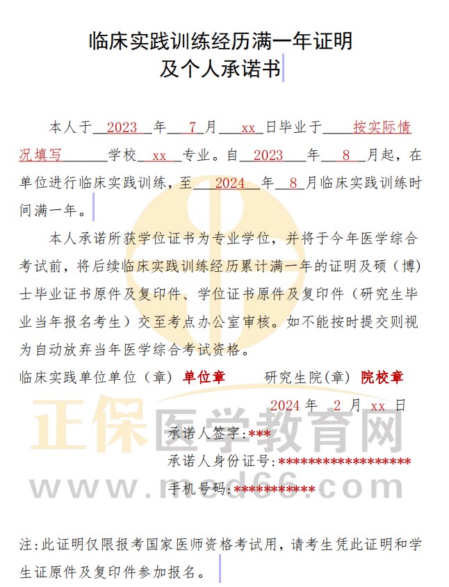2024年《臨床實踐訓練經(jīng)歷滿一年證明及個人承諾書》填寫注意事項