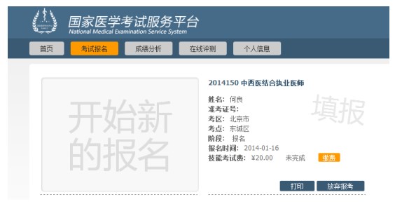 頁面左首顯示為“開始新的報(bào)名”,點(diǎn)擊“開始新的報(bào)名”即可開始進(jìn)行報(bào)名操作。同時(shí)在右側(cè)會(huì)順序列出在考試平臺(tái)中曾經(jīng)報(bào)考的考試項(xiàng)目及基本情況。注意:報(bào)名信息不提供修改功能,請(qǐng)務(wù)必檢查自己所報(bào)考的考試科目,考區(qū)/考點(diǎn)是否正確;如發(fā)現(xiàn)報(bào)考有誤,在網(wǎng)上報(bào)名期間,可通過報(bào)考項(xiàng)目方框右下方的“放棄報(bào)考”予以放棄,然后重新“開始新的報(bào)名”進(jìn)行報(bào)名。