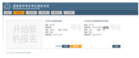 答:如需修改個人報名信息,須在網上報名截止日前,再次登陸服務平臺,進入“考試報名”欄目,在需要修改的報名下方點擊“重新報考”,進行信息修改,修改完成后務必再重新報名,報名成功后需重新打印《醫(yī)師資格考試網上報名成功通知單》。如下圖:
