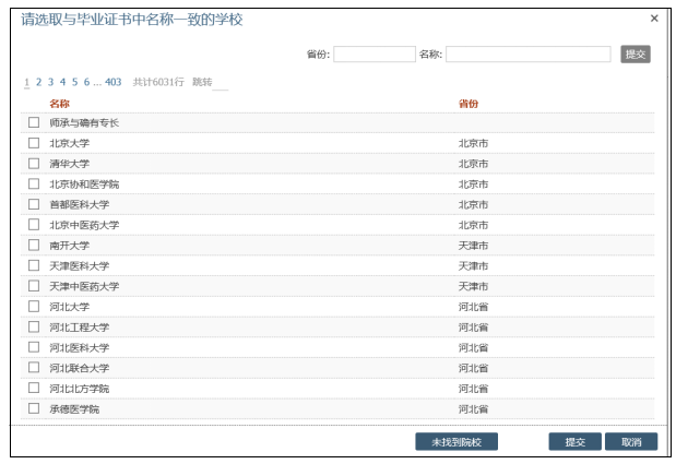 問:在填寫“教育及培訓(xùn)”信息時(shí),發(fā)現(xiàn)系統(tǒng)中未能找到對(duì)應(yīng)的畢業(yè)院校,該如何操作?