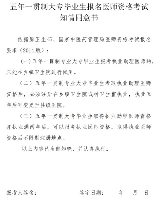 2.應(yīng)提交《五年一貫制大專畢業(yè)生報名醫(yī)師資格考試知情同意書》