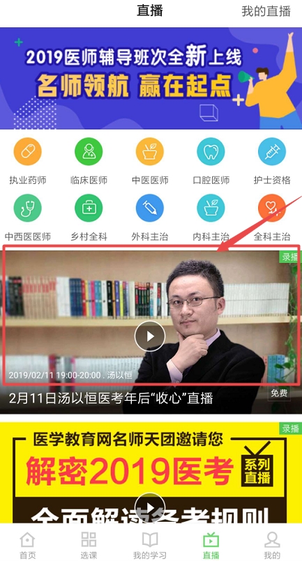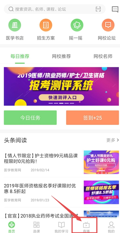 下載“醫(yī)學(xué)教育網(wǎng)App”,打開之后,如下圖,點擊下方“直播”: