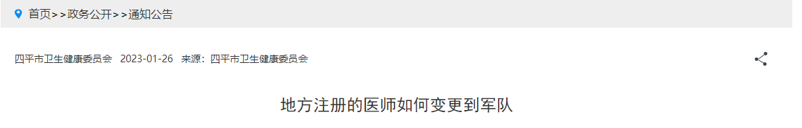 四平市衛(wèi)生健康委員會(huì)關(guān)于地方注冊(cè)的醫(yī)師如何變更到軍隊(duì),醫(yī)學(xué)教育網(wǎng)老師為大家整理總結(jié)如下,希望可以幫助到各位:
