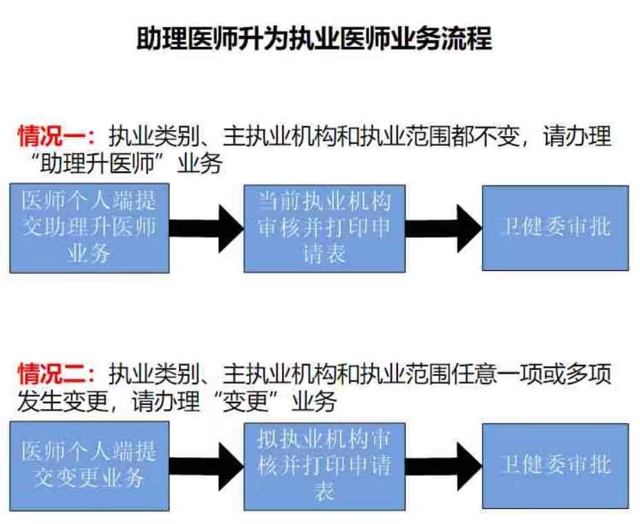 情況二:助理升為執(zhí)業(yè)醫(yī)師,若執(zhí)業(yè)類別、主執(zhí)業(yè)機(jī)構(gòu)和執(zhí)業(yè)范圍其中任何一項或多項發(fā)生了變更,請參考以下操作步驟: