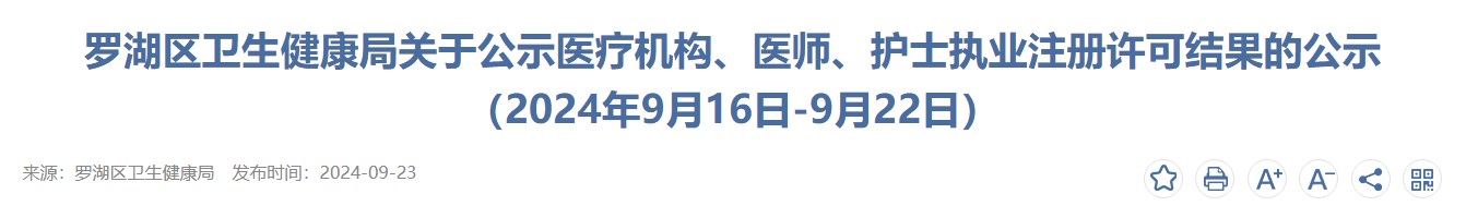 羅湖區(qū)衛(wèi)生健康局關(guān)于公示醫(yī)療機構(gòu)、醫(yī)師、護士執(zhí)業(yè)注冊許可結(jié)果的公示(2024年9月16日-9月22日)