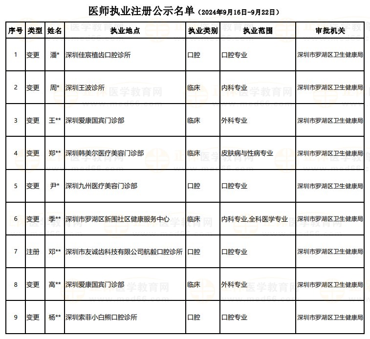 廣東深圳羅湖區(qū)2024年醫(yī)師資格執(zhí)業(yè)注冊許可結(jié)果公示(9月16日-9月22日)