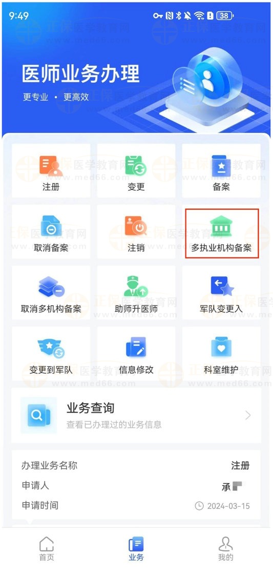 1、在“業(yè)務(wù)”界面中點(diǎn)擊【多執(zhí)業(yè)機(jī)構(gòu)備案】。