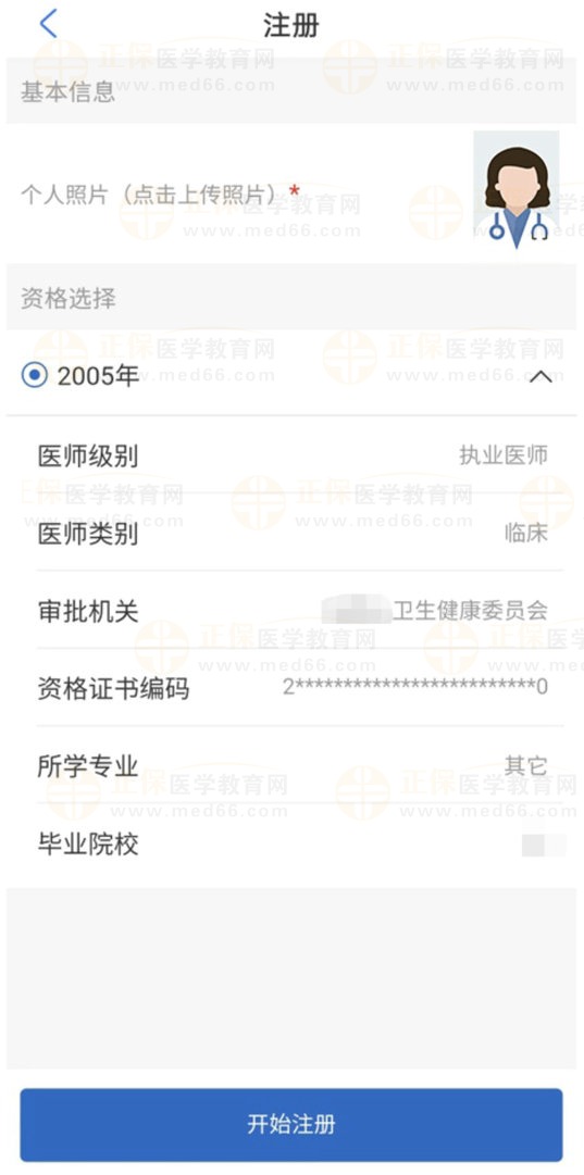 2、若無(wú)照片或需更換照片,可點(diǎn)擊照片位置進(jìn)行上傳,上傳成功后點(diǎn)擊【開(kāi)始注冊(cè)】按鈕。