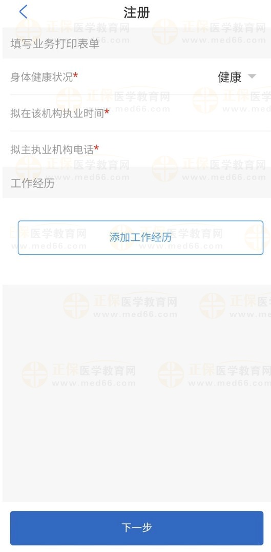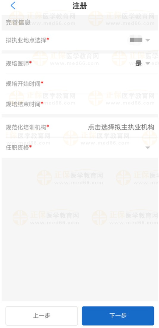3、填寫(xiě)業(yè)務(wù)信息:選擇擬執(zhí)業(yè)地點(diǎn)、規(guī)培醫(yī)師選擇“是”,然后選擇培訓(xùn)開(kāi)始時(shí)間和培訓(xùn)結(jié)束時(shí)間,填寫(xiě)擬主執(zhí)業(yè)機(jī)構(gòu)名稱(chēng),選擇任職資格,全部填寫(xiě)完成后,點(diǎn)擊【下一步】按鈕。