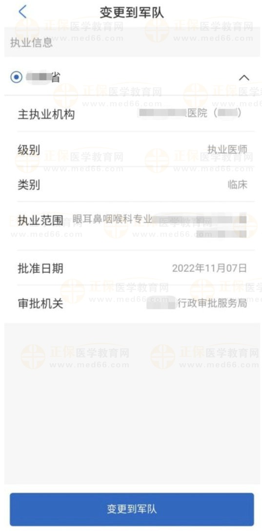 2、在執(zhí)業(yè)信息界面,點擊【變更到軍隊】按鈕。