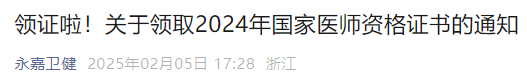 浙江永嘉縣2024年醫(yī)師資格考試證書開始發(fā)放!