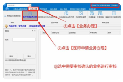 醫(yī)師個(gè)人端業(yè)務(wù)提交后,聯(lián)系擬執(zhí)業(yè)機(jī)構(gòu)登錄《醫(yī)師電子化注冊(cè)信息系統(tǒng)(機(jī)構(gòu)版)》:在【業(yè)務(wù)辦理】-【醫(yī)師申請(qǐng)業(yè)務(wù)辦理】下審核并且打印申請(qǐng)表;