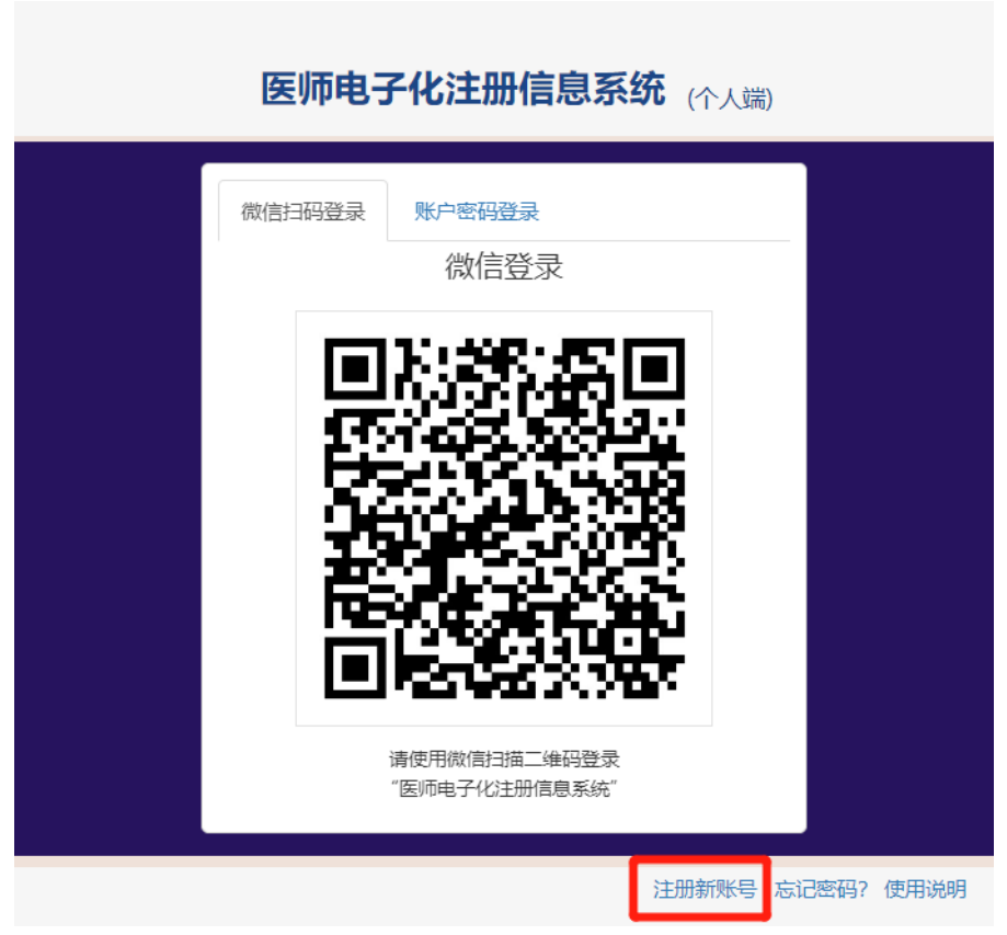 在“醫(yī)師電子化注冊信息系統(tǒng)(個人端)”頁面,點擊登錄界面右下角的【注冊新賬號】。